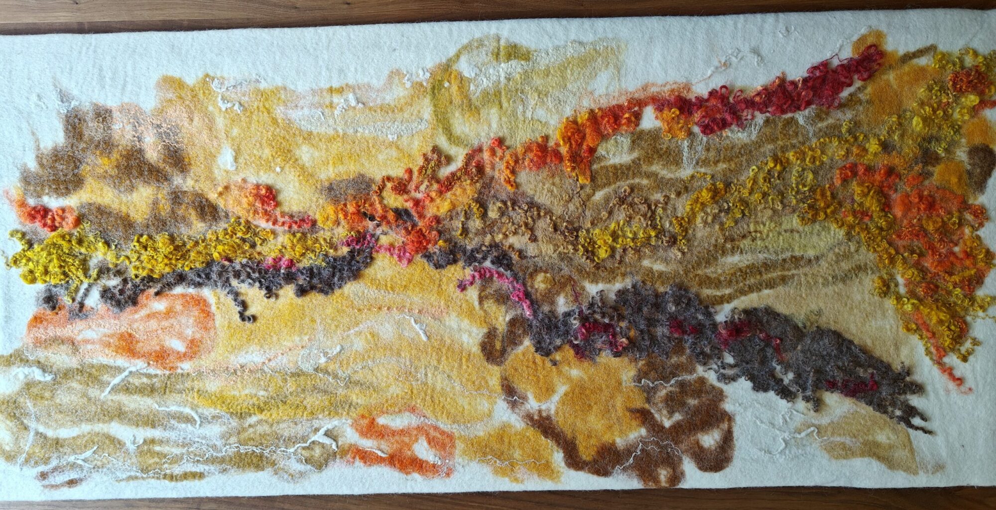 Het is grappig om met vilt diepte te creƫren in een werk. Niet wat verdikkingen hier en daar, maar echte opstaande of hangende randen. Ik heb er twee voorbeelden van in de collectie: de swirl en de lamel.